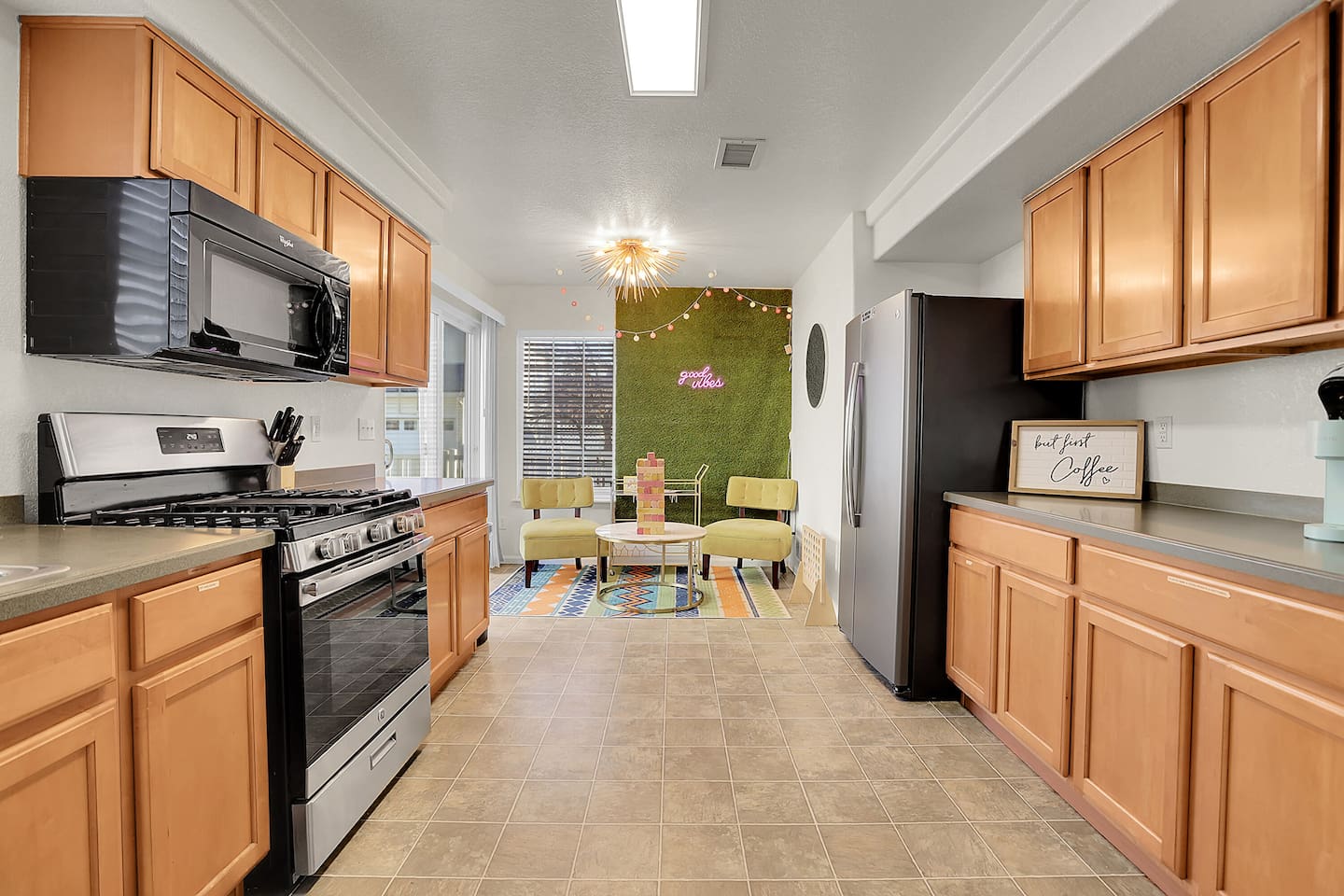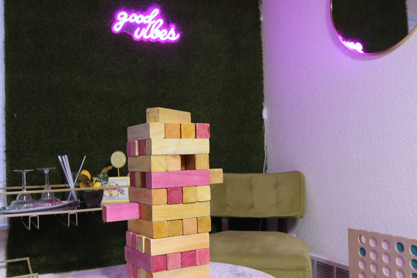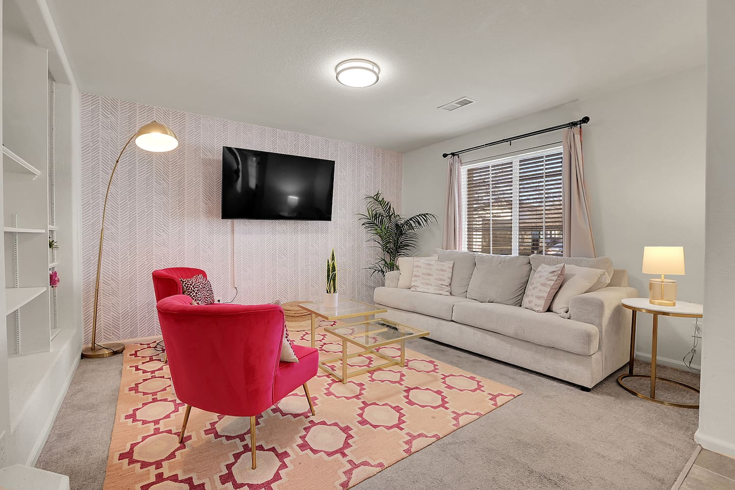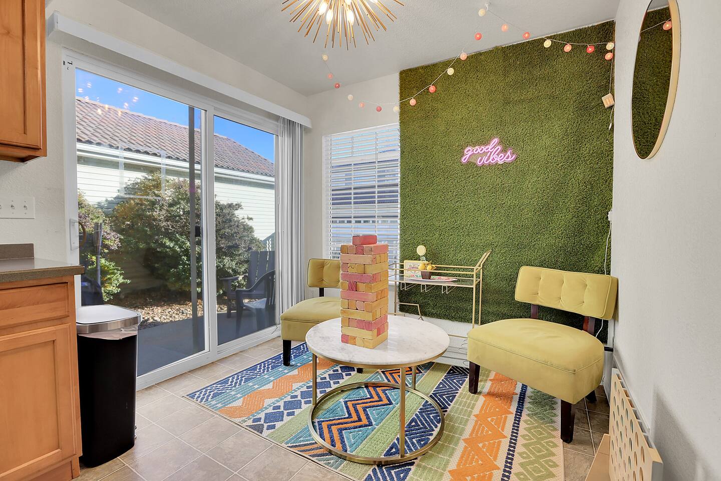 Our home is crafted to be a cheerful and stylish retreat. The living room invites you to unwind on the large sofa, enjoy a movie on the 65" Smart TV with streaming services enabled. For those who need to stay connected, a dedicated workspace with high-speed internet is available. The fully equipped kitchen features stainless steel appliances, a Keurig and drip coffee maker, and everything you need to prepare delicious meals. Enjoy your creations at the chic dining table, perfect for morning coffee or group dinners. A highlight of our home is the unique game area, complete with a faux grass wall, a pink neon 'good vibes' sign, and giant games like Jenga and Connect 4—a perfect spot for fun and photos! When it's time to rest, you'll find four comfortable bedrooms that sleep up to 10 guests. Each room features comfortable mattresses, soft linens, and ample closet space. The home includes 2.5 bathrooms stocked with fresh towels and basic toiletries for your convenience. Step outside to your private patio and backyard. Fire up the charcoal grill for a BBQ, dine al fresco at the patio table, challenge a friend to a game of giant chess. Key Amenities: 4 bedrooms, 5 beds (sleeps 10) Dedicated workspace Fully stocked kitchen with Keurig & drip coffee Private patio with charcoal grill, outdoor furniture, and giant chess Central AC & Heating Washer & dryer in unit High-speed internet & 65" Smart TV Note: The fireplace shown is for aesthetic purposes only and is currently disabled for safety.