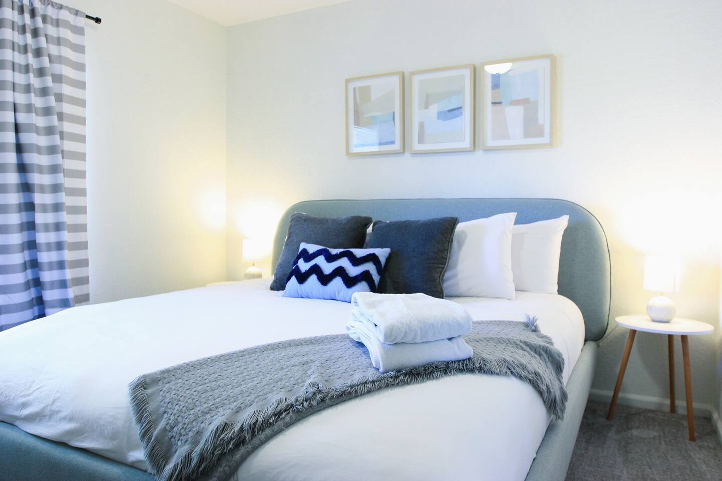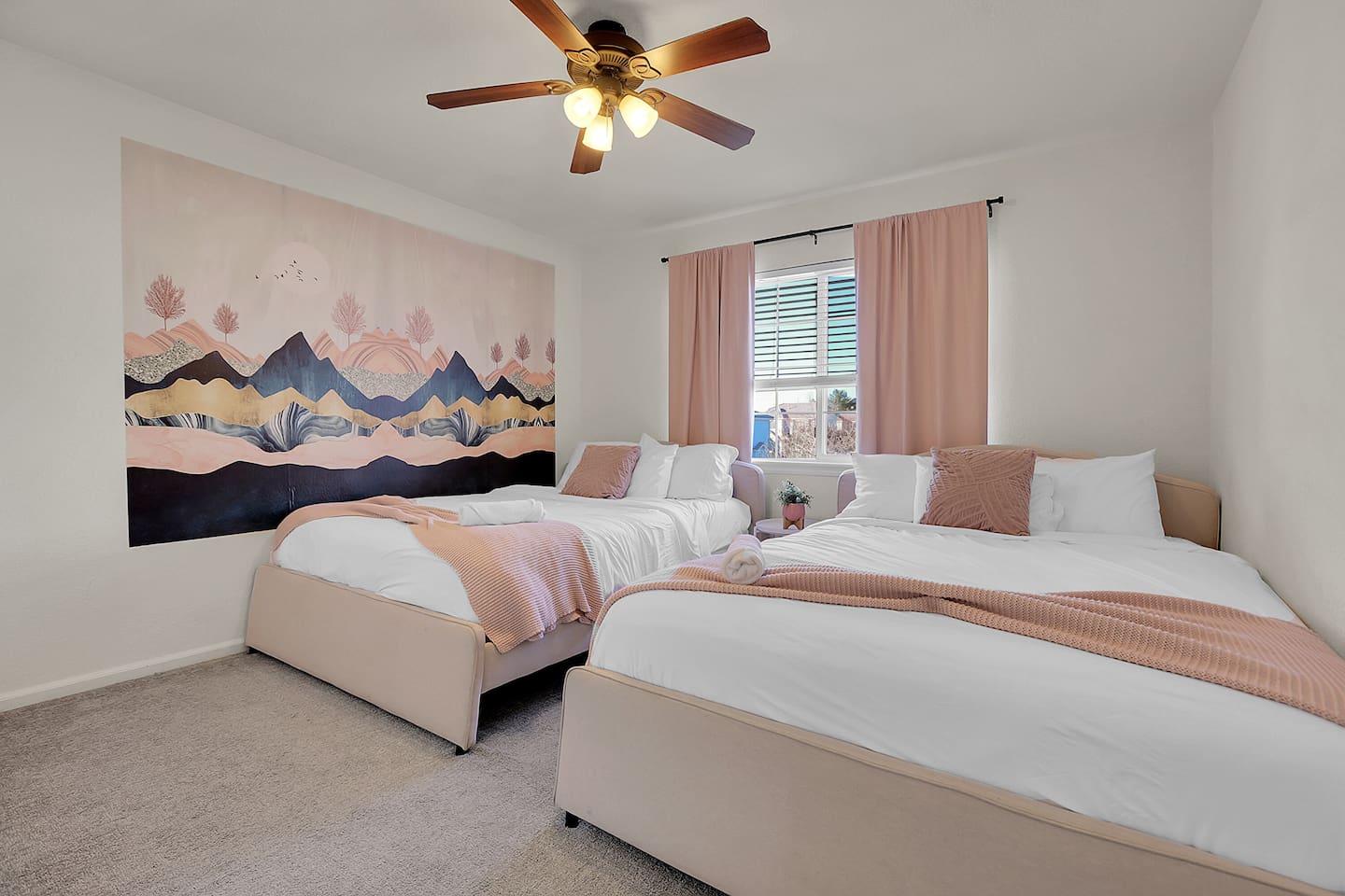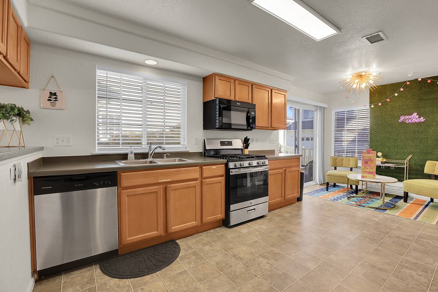 Our home is crafted to be a cheerful and stylish retreat. The living room invites you to unwind on the large sofa, enjoy a movie on the 65" Smart TV with streaming services enabled. For those who need to stay connected, a dedicated workspace with high-speed internet is available. The fully equipped kitchen features stainless steel appliances, a Keurig and drip coffee maker, and everything you need to prepare delicious meals. Enjoy your creations at the chic dining table, perfect for morning coffee or group dinners. A highlight of our home is the unique game area, complete with a faux grass wall, a pink neon 'good vibes' sign, and giant games like Jenga and Connect 4—a perfect spot for fun and photos! When it's time to rest, you'll find four comfortable bedrooms that sleep up to 10 guests. Each room features comfortable mattresses, soft linens, and ample closet space. The home includes 2.5 bathrooms stocked with fresh towels and basic toiletries for your convenience. Step outside to your private patio and backyard. Fire up the charcoal grill for a BBQ, dine al fresco at the patio table, challenge a friend to a game of giant chess. Key Amenities: 4 bedrooms, 5 beds (sleeps 10) Dedicated workspace Fully stocked kitchen with Keurig & drip coffee Private patio with charcoal grill, outdoor furniture, and giant chess Central AC & Heating Washer & dryer in unit High-speed internet & 65" Smart TV Note: The fireplace shown is for aesthetic purposes only and is currently disabled for safety.