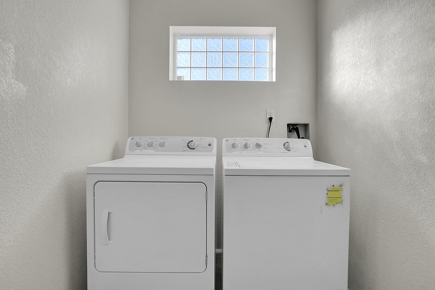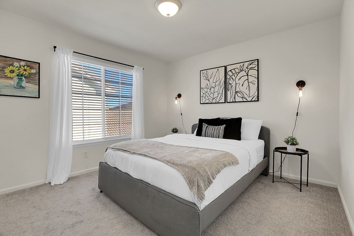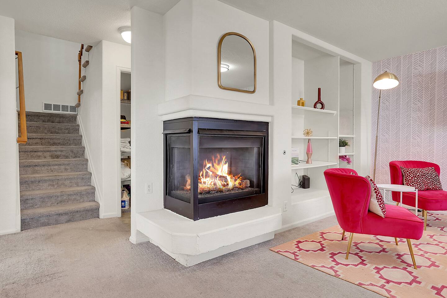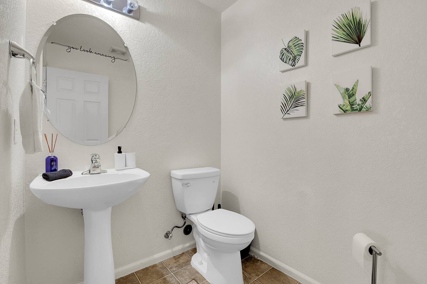 Our home is crafted to be a cheerful and stylish retreat. The living room invites you to unwind on the large sofa, enjoy a movie on the 65" Smart TV with streaming services enabled. For those who need to stay connected, a dedicated workspace with high-speed internet is available. The fully equipped kitchen features stainless steel appliances, a Keurig and drip coffee maker, and everything you need to prepare delicious meals. Enjoy your creations at the chic dining table, perfect for morning coffee or group dinners. A highlight of our home is the unique game area, complete with a faux grass wall, a pink neon 'good vibes' sign, and giant games like Jenga and Connect 4—a perfect spot for fun and photos! When it's time to rest, you'll find four comfortable bedrooms that sleep up to 10 guests. Each room features comfortable mattresses, soft linens, and ample closet space. The home includes 2.5 bathrooms stocked with fresh towels and basic toiletries for your convenience. Step outside to your private patio and backyard. Fire up the charcoal grill for a BBQ, dine al fresco at the patio table, challenge a friend to a game of giant chess. Key Amenities: 4 bedrooms, 5 beds (sleeps 10) Dedicated workspace Fully stocked kitchen with Keurig & drip coffee Private patio with charcoal grill, outdoor furniture, and giant chess Central AC & Heating Washer & dryer in unit High-speed internet & 65" Smart TV Note: The fireplace shown is for aesthetic purposes only and is currently disabled for safety.
